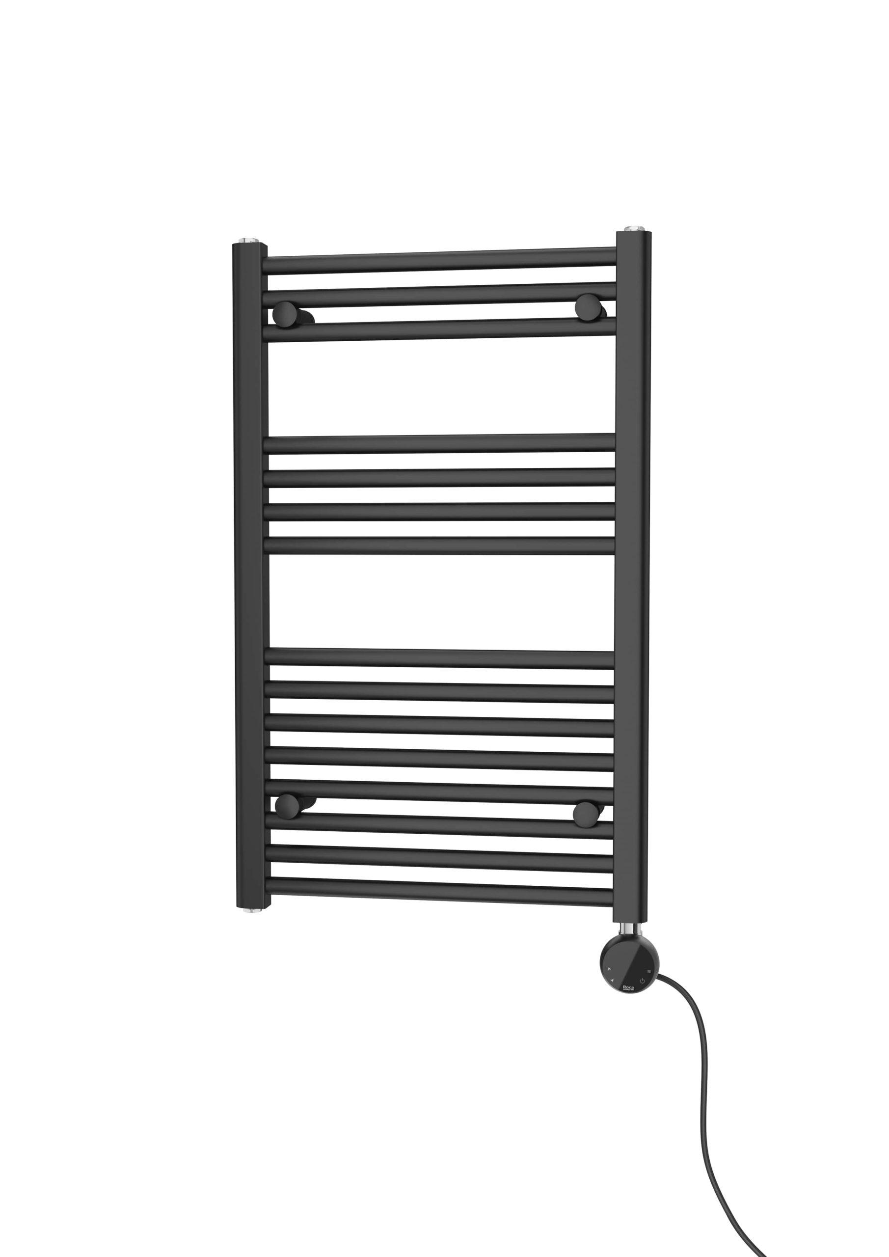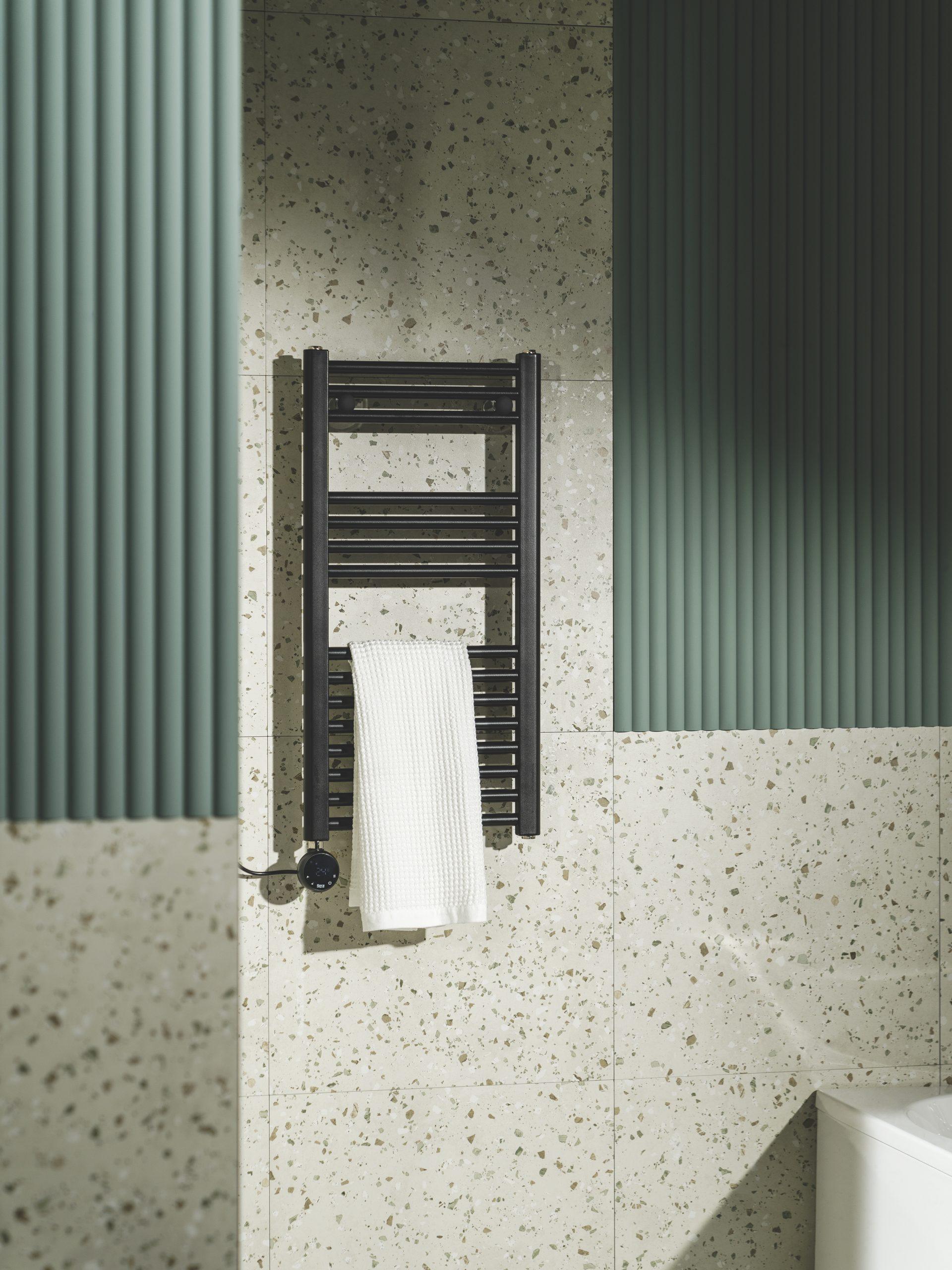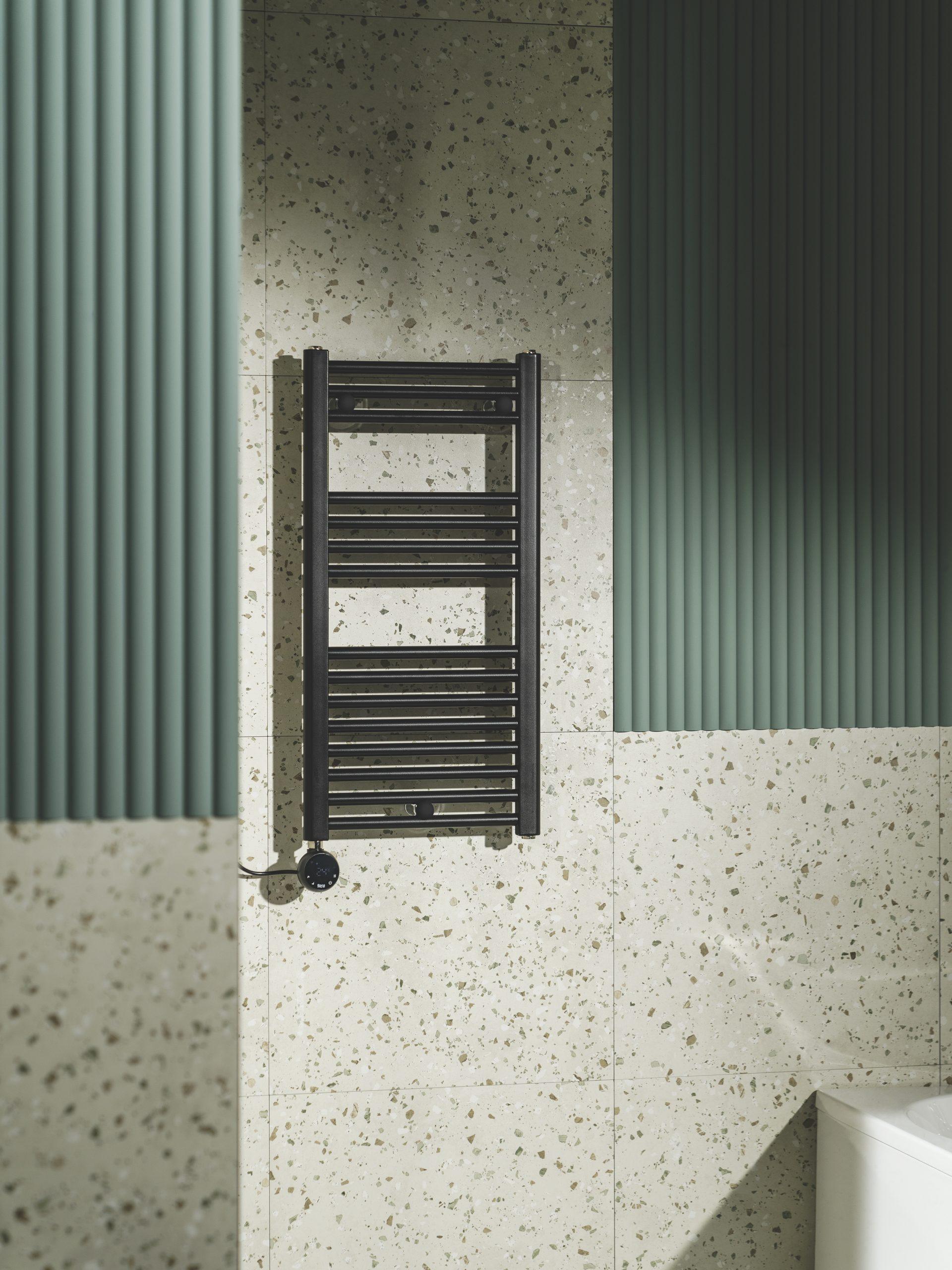 Toalheiro Elétrico Roca 300W Preto Mate com acabamento preto mate, termóstato digital integrado e vários modos de aquecimento. Dimensões: 500×800 mm. Ideal para manter as toalhas secas, aquecidas e a casa de banho mais confortável.